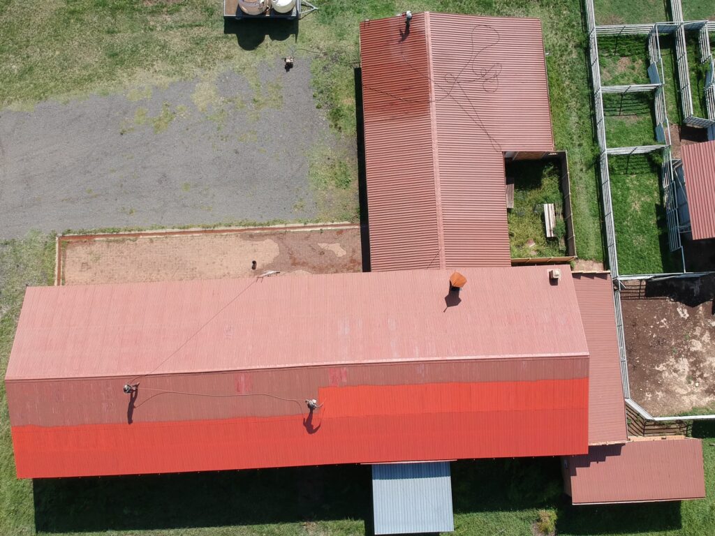 Indien nodig, word “degreaser” of Kopersulfaat met ‘n rugsak spuit op die hele oppervlak gespuit. Hierdie middels verwyder vetterige kolle op die dak en berei die oppervlak voor vir goeie klewing van verf. Let wel dat die produkte nie skadelik is vir die omgewing nie.